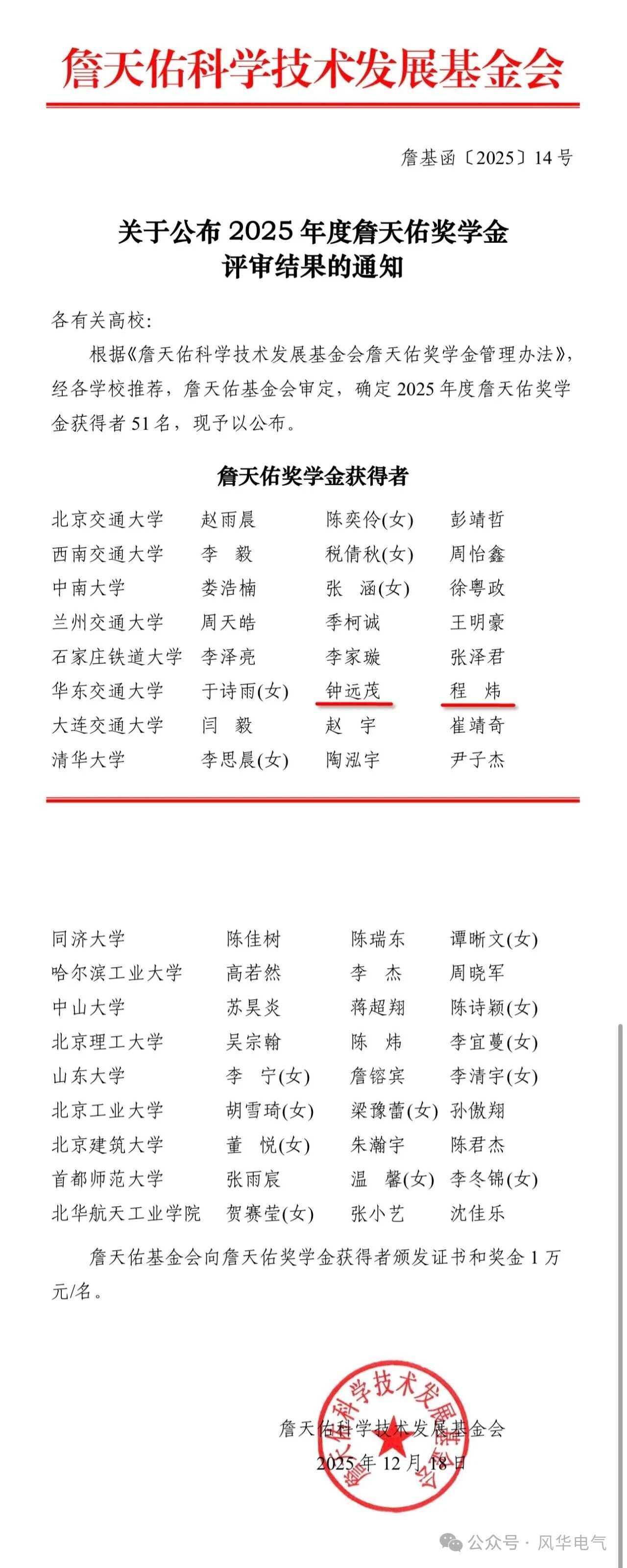 近日,2025年度詹天佑奖学金获奖者名单公布,我院电气(铁道)2022-2班钟远茂、轨道交通信号2022-1班程玮荣获詹天佑奖学金。