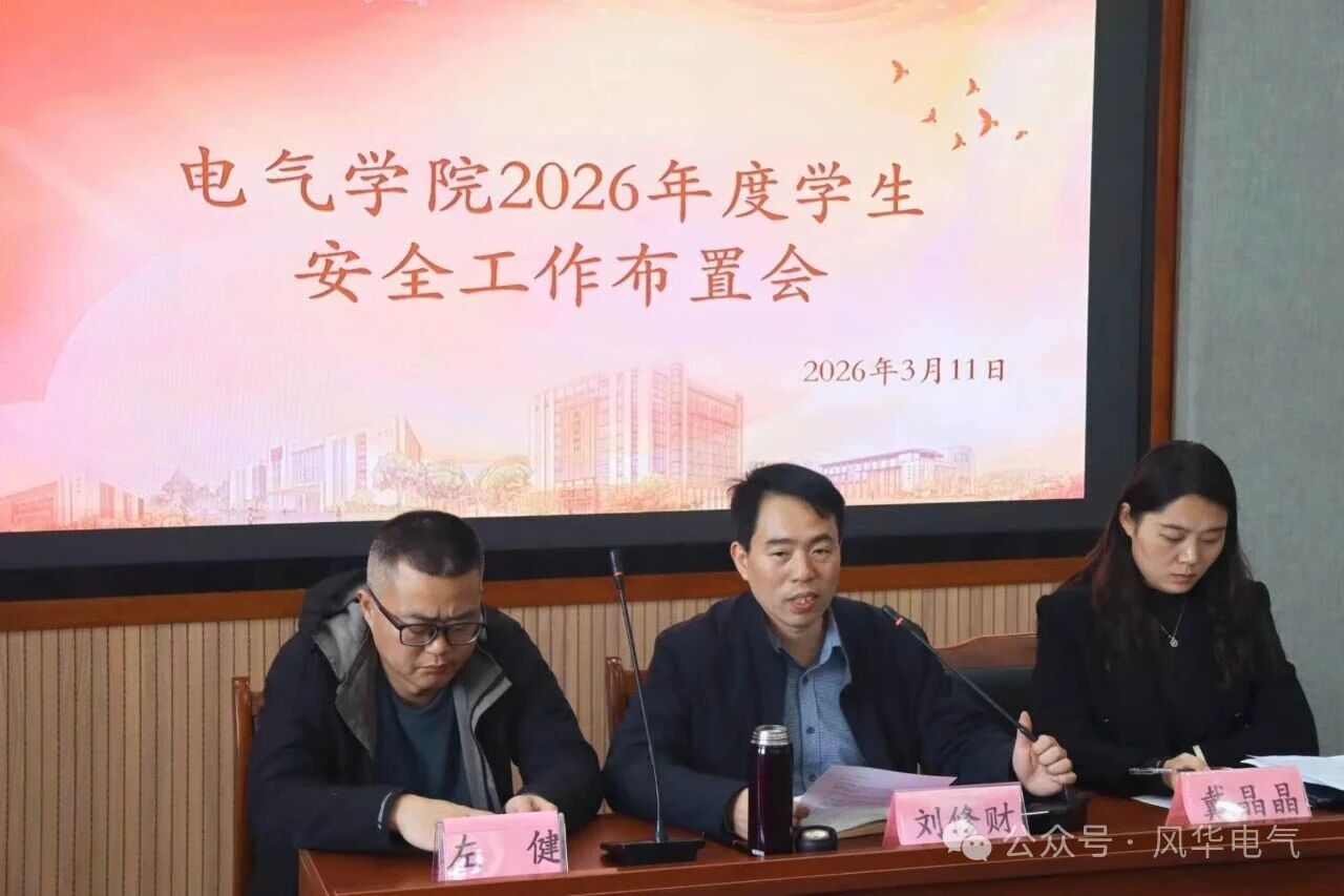 为深入贯彻落实学校关于校园安全工作的相关要求,切实筑牢学院安全防线,3月12日,电气学院在学院403会议室组织召开2026年度学生安全工作布置会。学院党委副书记刘修财、学工办主任兼团委书记戴晶晶、安全文明创建中心指导老师左健出席会议,学院安全文明创建中心全体学生骨干及各班级消防委员代表参加会议。